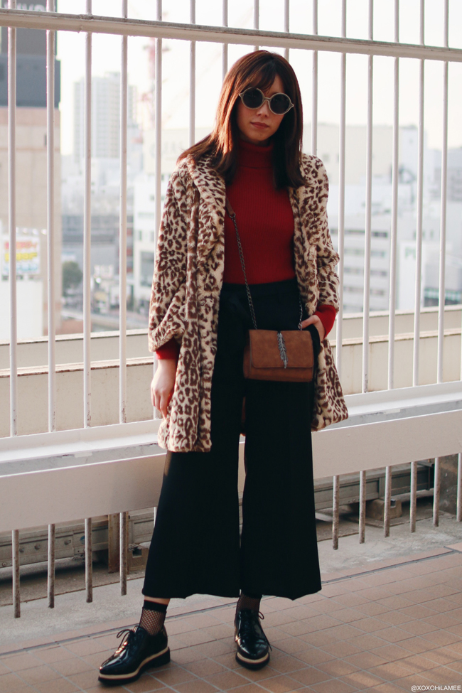 それに、メッシュソックスやレオパードコートでトレンド感をプラス。